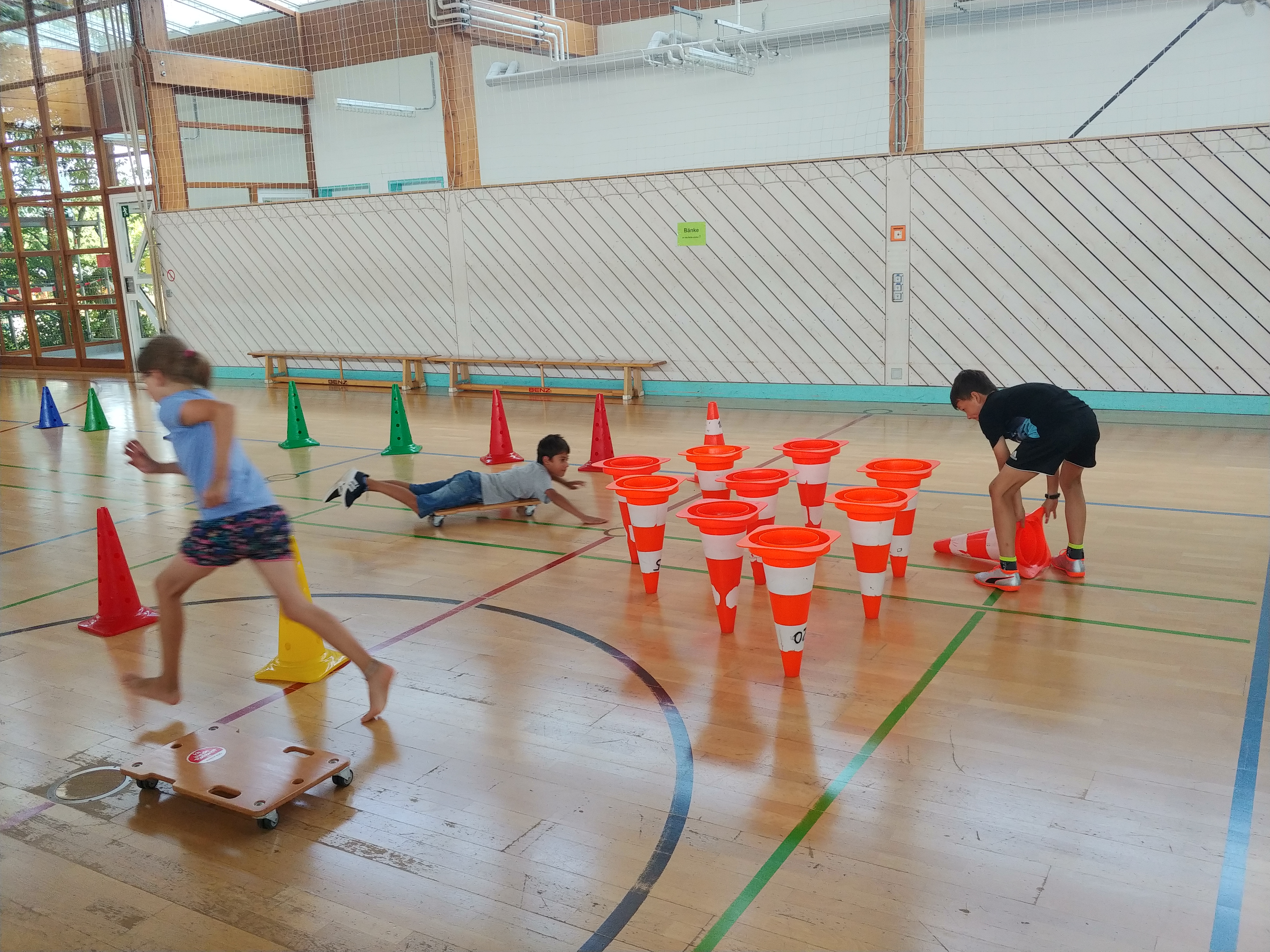 Beim Cross Boccia ging es darum, die eigenen „Kugeln“ möglichst nahe an die Zielkugel zu werfen. Die große Herausforderung für die Kinder bestand also darin, die eigene Kraft richtig einzuschätzen und den richtigen Abwurfwinkel zu finden. Nach einigen Übungen konnte der Wettkampf beginnen und die Kinder bewiesen echten Teamgeist, freuten sich aber auch über die Leistungen des anderen Teams. Eine Besonderheit beim Cross Boccia ist, dass die Spieler sich mit dem Spiel weiterbewegen und so der gesamte Sportplatz zum Spielfeld wird. Beim französischen Pendant zum Boccia, dem Boule, lernten die Kinder, das beim Cross Boccia Geübte, auf ein anderes Spiel zu übertragen. Die Kinder nutzen die Sprunggrube als Spielfeld. Nun mussten sie zielgenau werfen, da die Kugeln, anders als beim Boccia, meist am Landepunkt liegen blieben. Nach kurzer Umgewöhnung stellten die Kinder ihre Zielgenauigkeit unter Beweis und der Spielleiter musste zunehmend genau nachmessen, welche Kugel dem Ziel tatsächlich am nächsten lag.