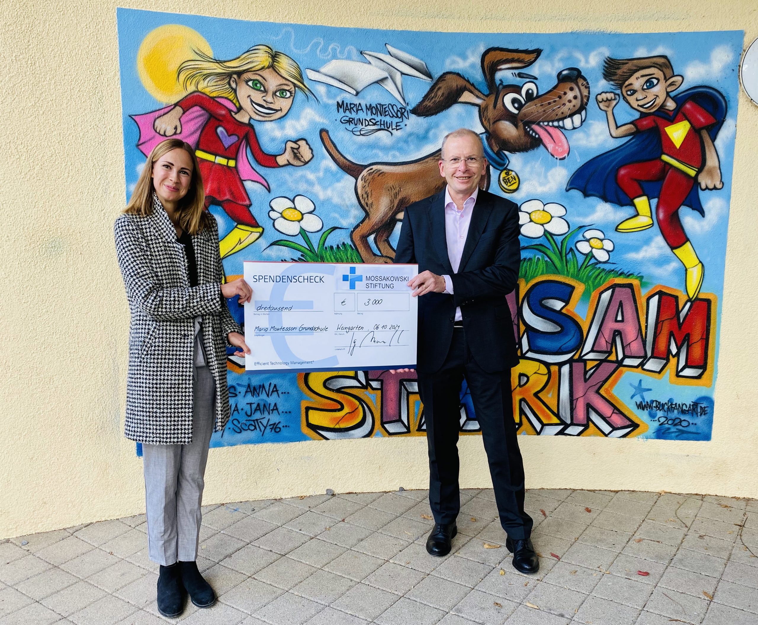 Damit erreichte das Medienteam den 2. Platz, der mit einem Preisgeld von € 3000 dotiert ist. Dank der Mossakowski-Stiftung, die den Wettbewerb ausgelobt hat, kann das Team der Maria Montessori Grundschule Hausen die Digitalisierung an der Schule nun weiter vorantreiben und Soft- sowie Hardware dafür anschaffen. Jürgen Mossakowski ließ es sich nicht nehmen, den Scheck persönlich vor Ort  an Jennifer Fröhlich zu überreichen und die Schule bei einem Rundgang noch näher kennenzulernen. Hinter der Stiftung verbergen sich  die Eheleute Vera und Jürgen Mossakowski, die einen Beitrag dazu leisten wollen, dass Kinder und junge Menschen die Chance auf ein gesundes und erfolgreiches Leben haben. Zu diesem Zweck unterstützt die Mossakowski-Stiftung diverse Bildungsprojekte und engagiert sich im Gesundheitswesen weltweit.