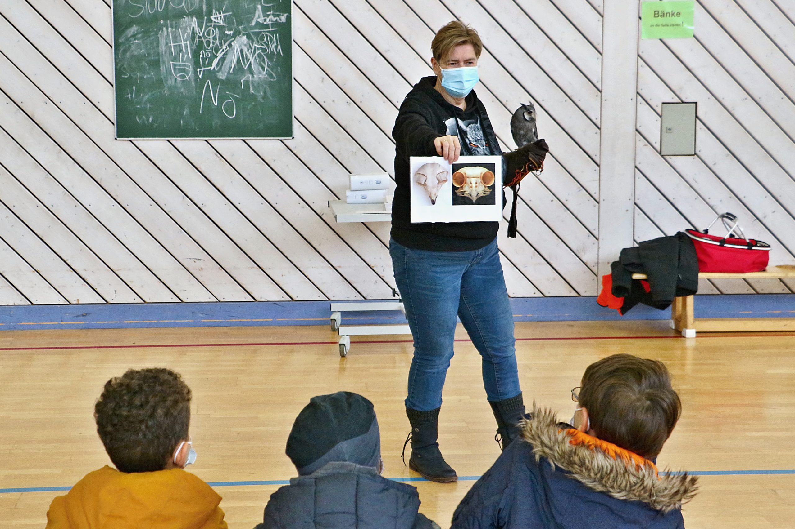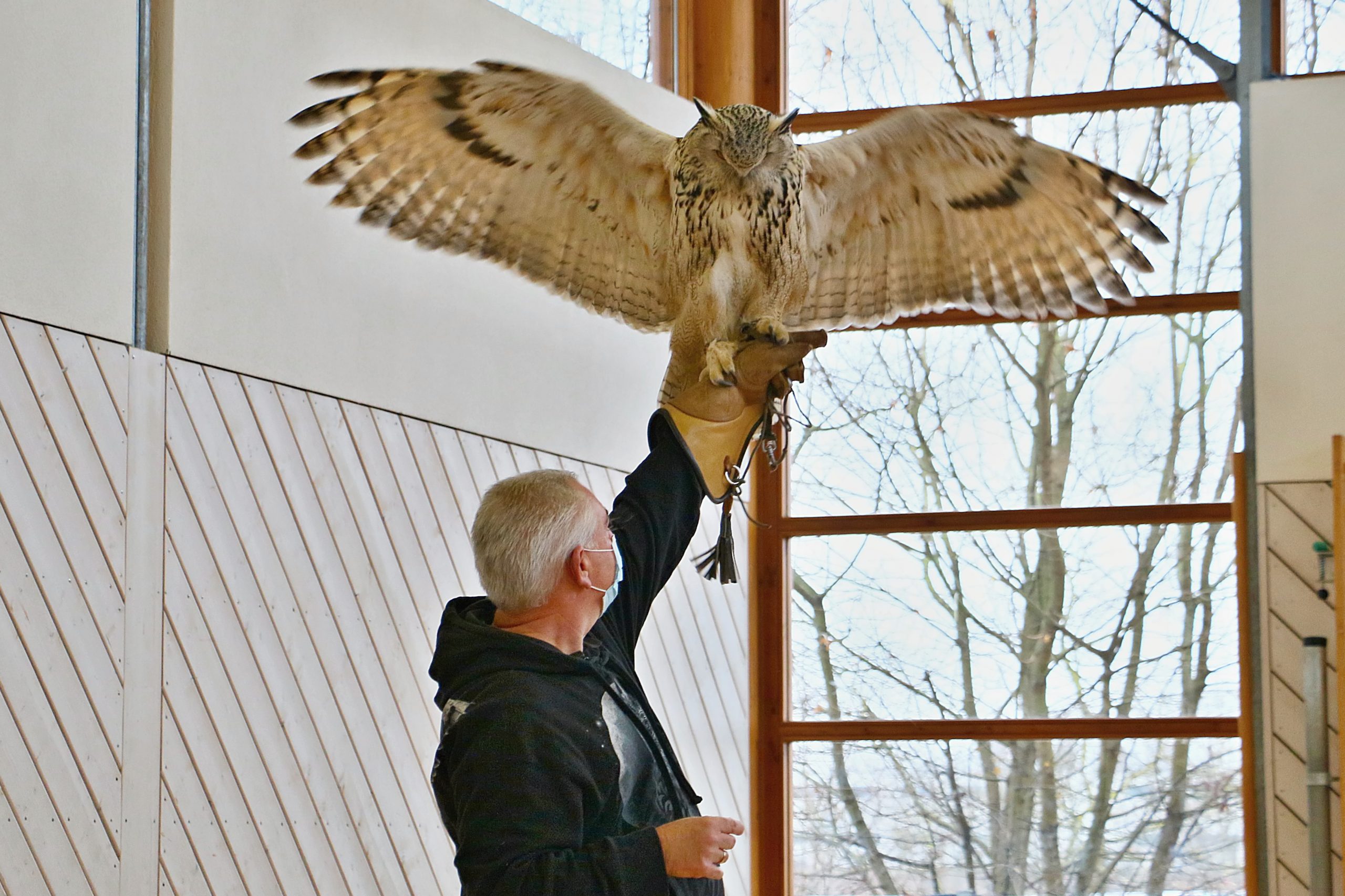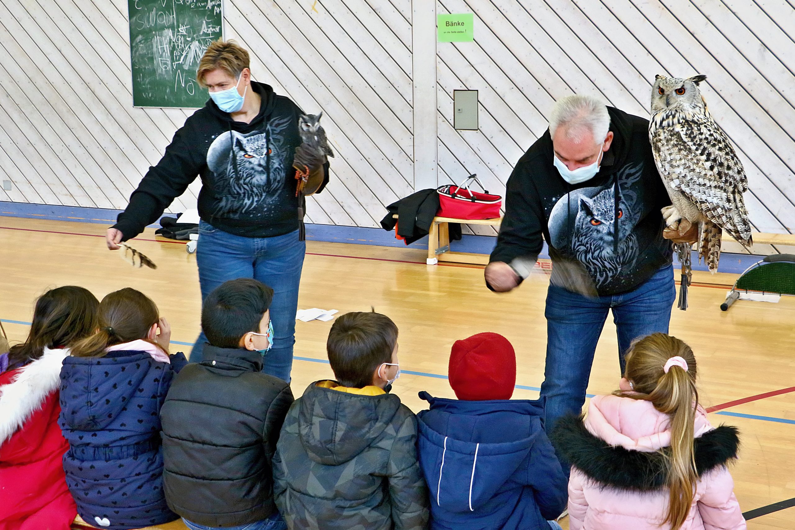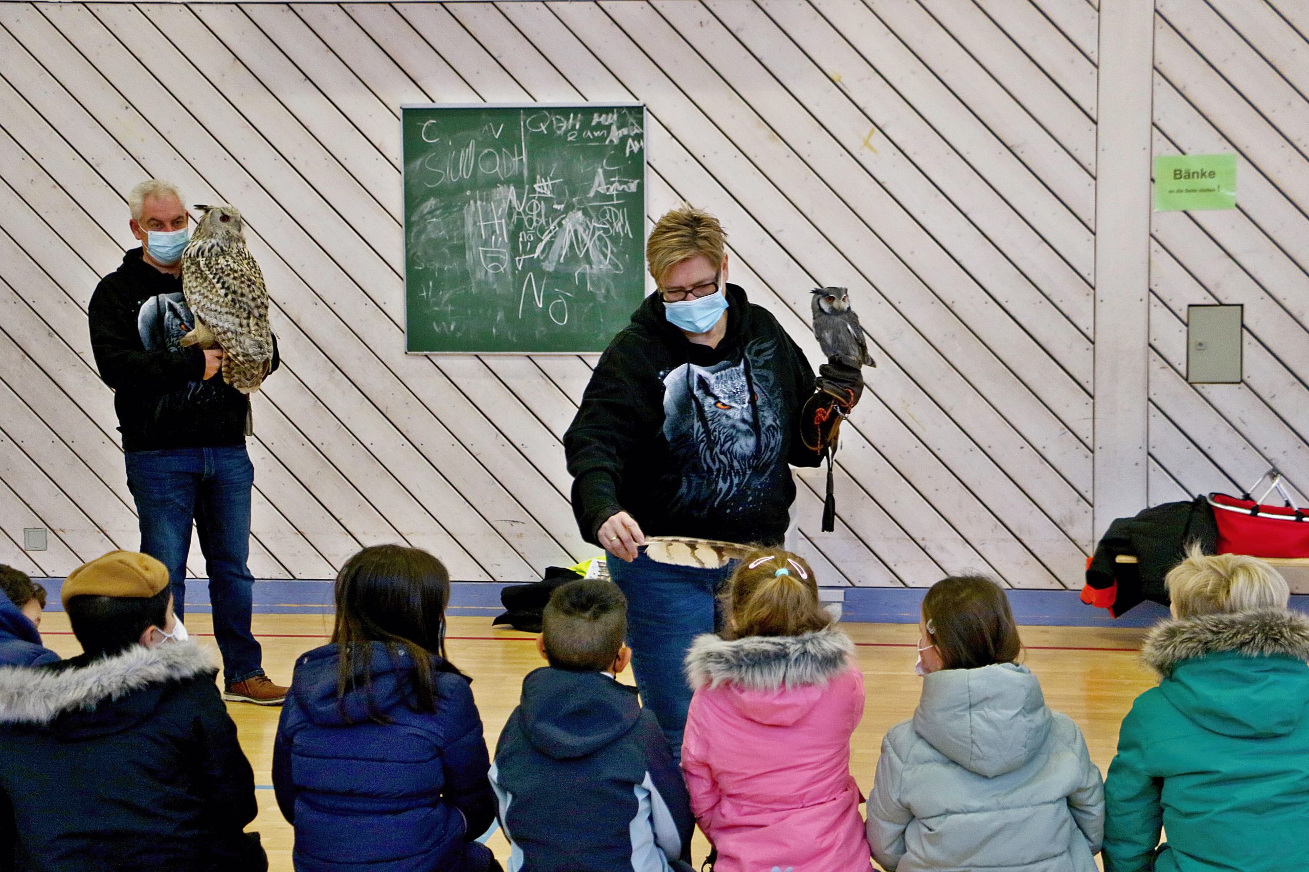 Weltweit gibt es über 200 verschiedene Eulenarten, zwei davon hatte das Ehepaar Wiesinger auf ihren Lederhandschuhen sitzen, als die erste Klasse die Halle betrat.