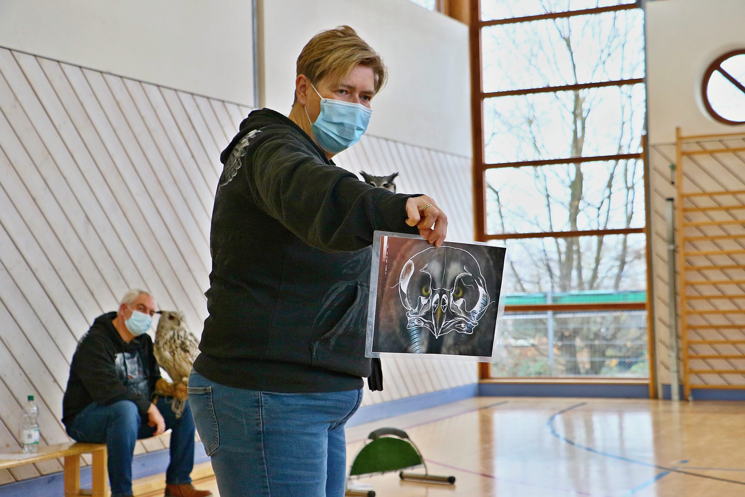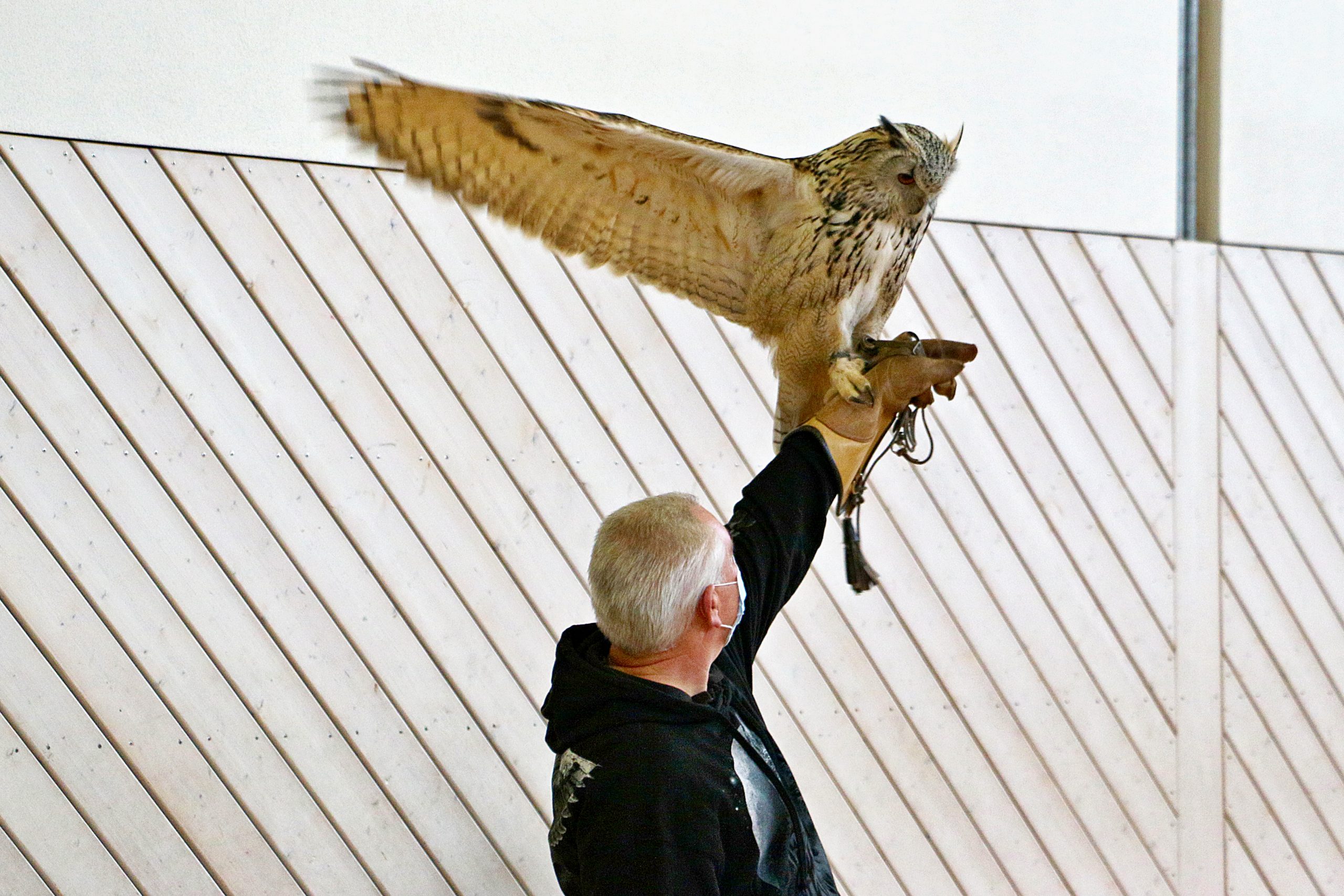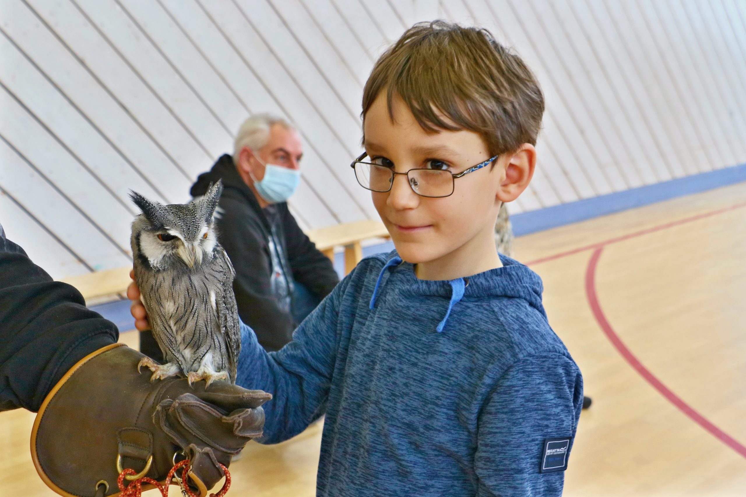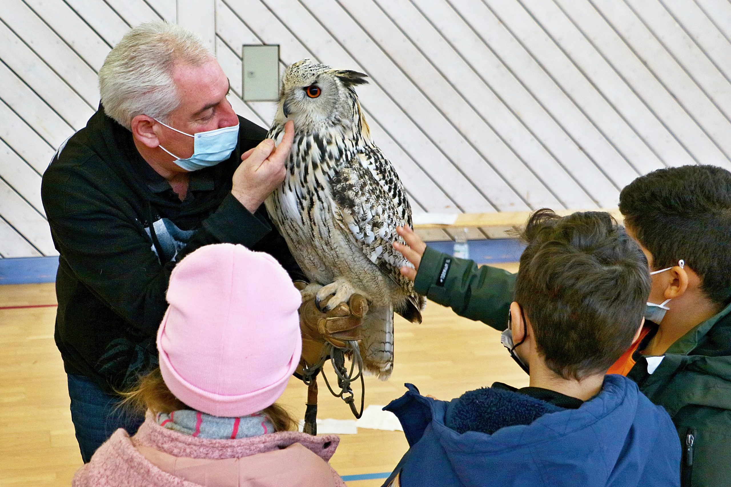 Weltweit gibt es über 200 verschiedene Eulenarten, zwei davon hatte das Ehepaar Wiesinger auf ihren Lederhandschuhen sitzen, als die erste Klasse die Halle betrat.