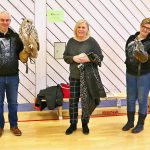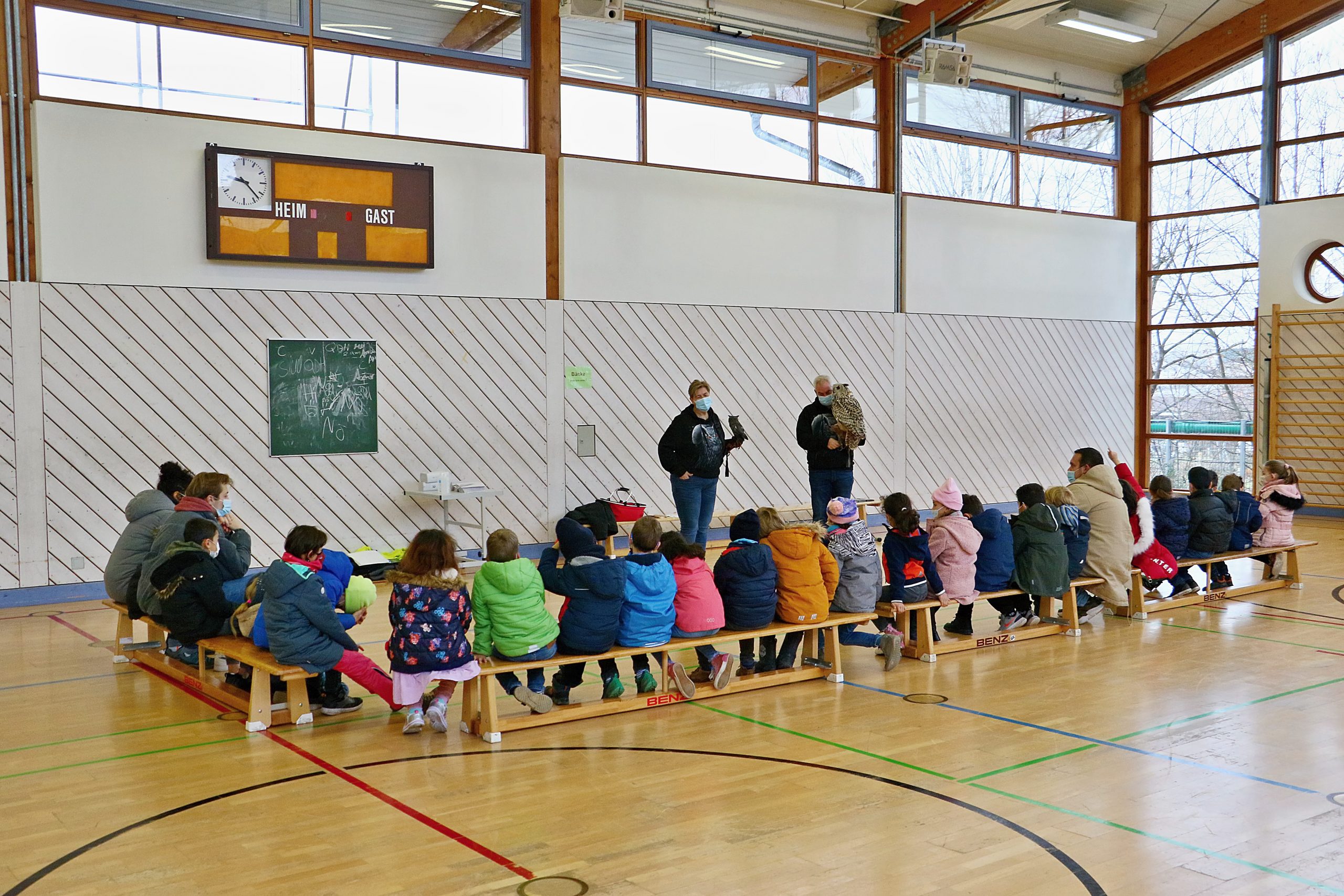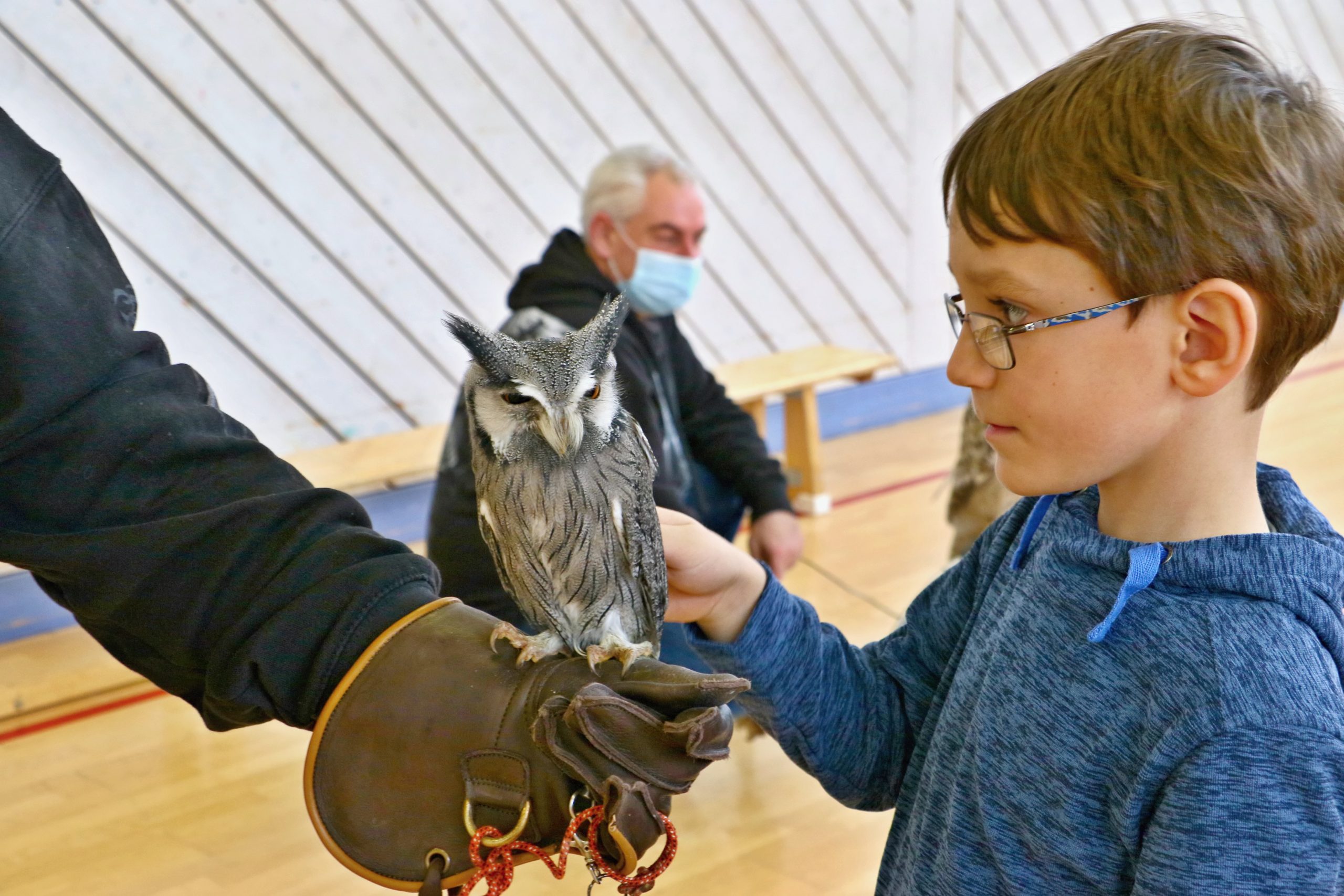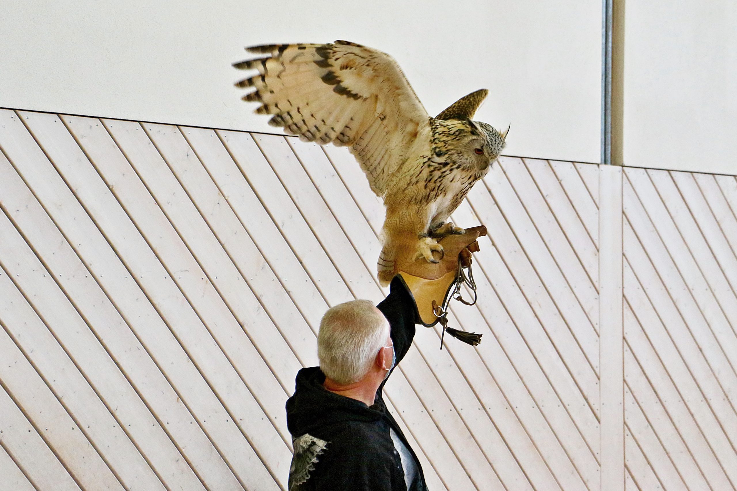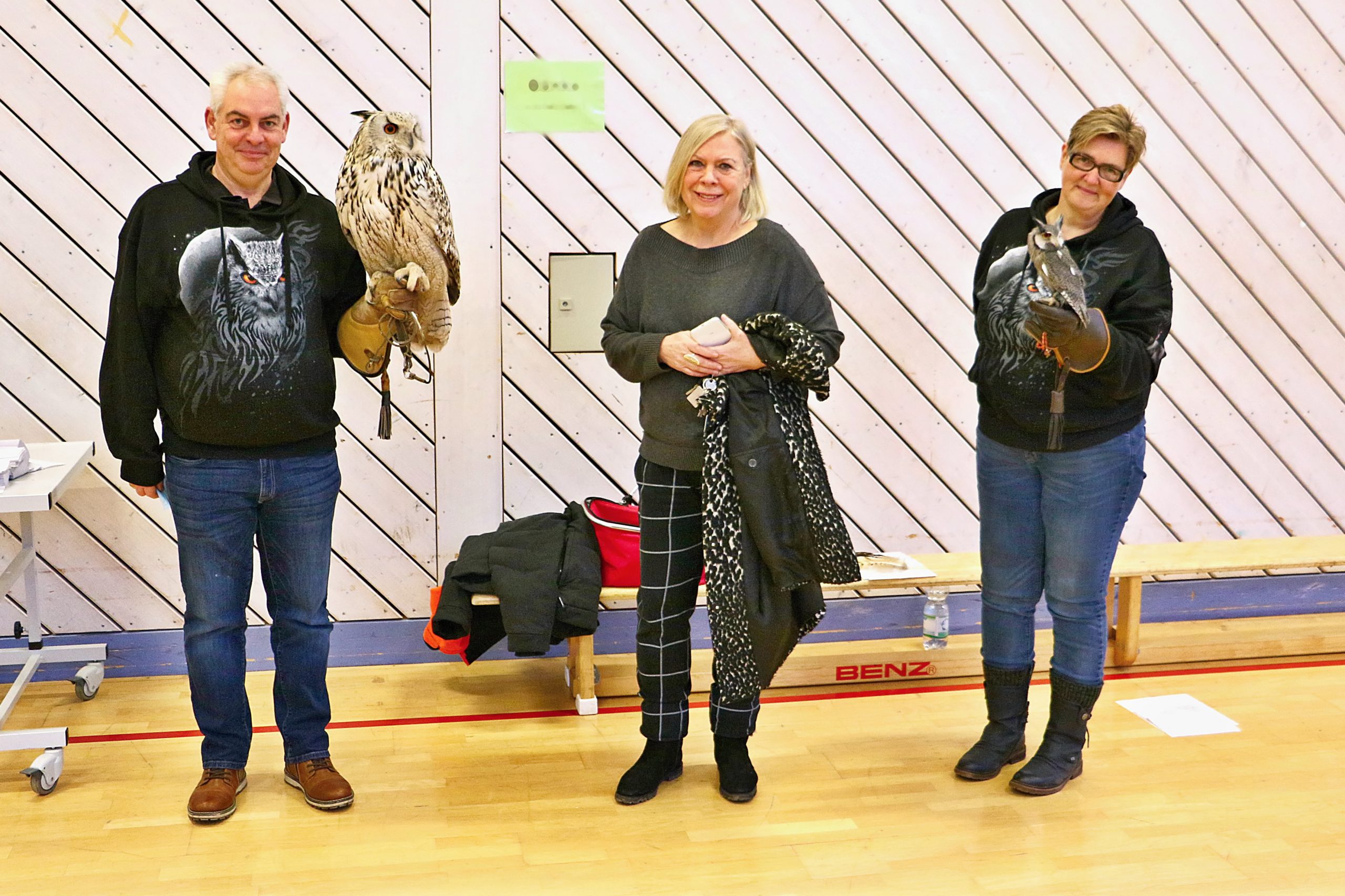 Weltweit gibt es über 200 verschiedene Eulenarten, zwei davon hatte das Ehepaar Wiesinger auf ihren Lederhandschuhen sitzen, als die erste Klasse die Halle betrat.