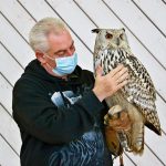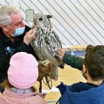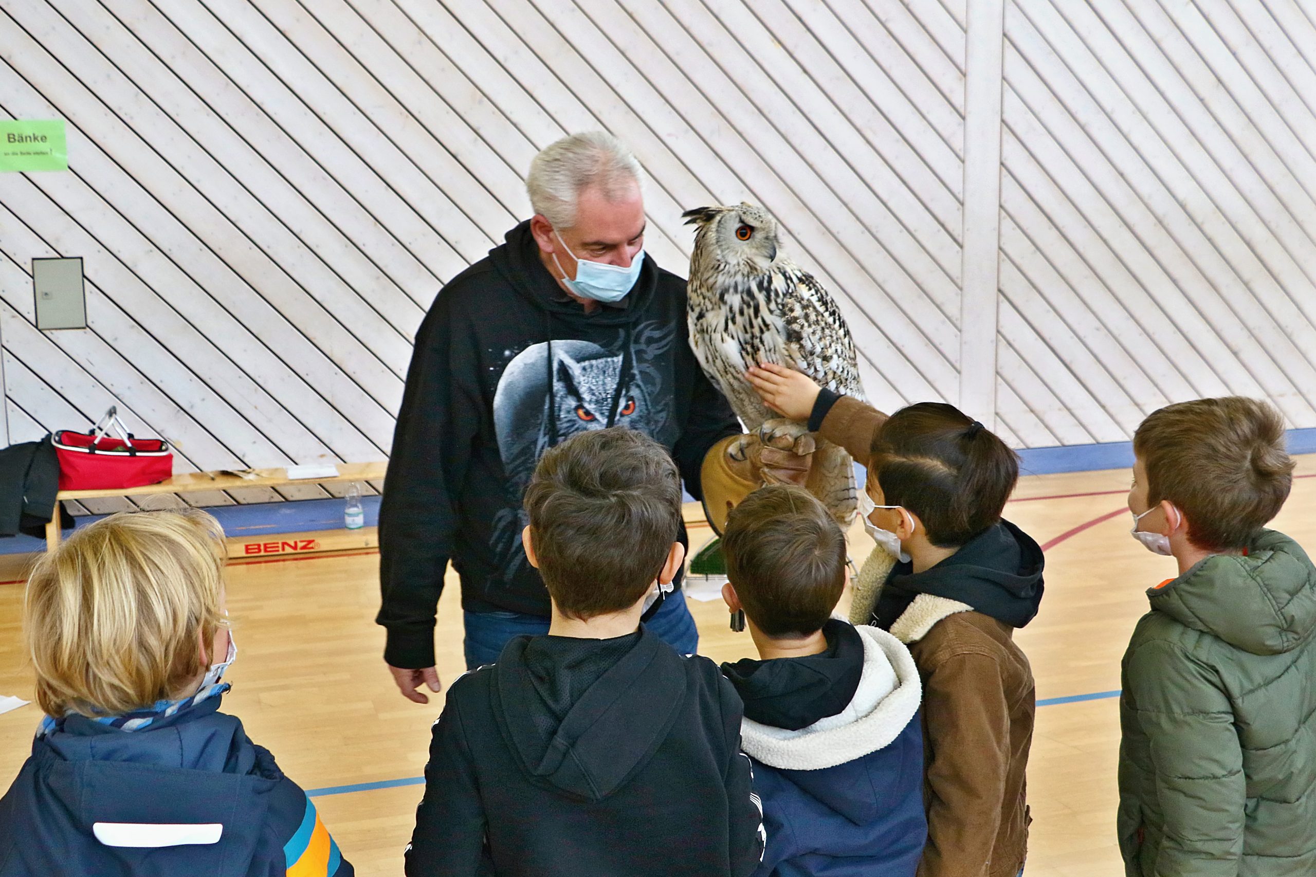 Der Schlusspunkt der außergewöhnlichen Unterrichtsstunde war dann zugleich auch der Höhepunkt: die beiden Eulen-Damen verlangten nach ihren wohlverdienten Streicheleinheiten. Nachdem die Kinder sich ihre Hände desinfiziert hatten und Jürgen Wiesinger das richtige Vorgehen erklärt hatte, durfte jeder, der sich traute, Emma und Mimi vorsichtig über Brust oder Flügel streicheln.