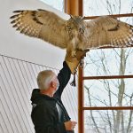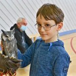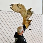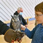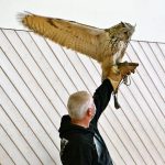 Auf der Hand von Falkner Jürgen Wiesinger thronte Emma, eine elfjährige sibirische Uhu-Dame. Das imposante Greifvogel-Weibchen wiegt runde vier Kilogramm und besitzt bei einer Größe von rund 75 Zentimeter eine Flügelspannweite von über 1,70 Meter. Dies stellte Emma auch sogleich eindrucksvoll unter Beweis, indem sie ihre Flügel zur Begrüßung weit spreizte. Herr Wiesinger, der den Greifvogelzoo mit seiner Frau seit 2008 betreibt, schilderte den Kindern dann die Besonderheiten des sibirischen Uhus, der weltweit größten Eulenart. Er kann seine Beutetiere auf zwei verschiedene Arten erlegen, er ist ein Biss- und Grifftöter. Grifftöter deshalb, weil er seine spitzen Fänge, von denen jeder eine Kraft von 200 Kilogramm aufbringt, in den Körper der Beute schlägt und diese damit tödlich verletzt. Dank dieser enormen Kraft ist es dem Uhu möglich Tiere bis zur Größe eines Fuchses zu erbeuten. Auf Grund seiner Größe und Kraft besitzt der Uhu auch keine natürlichen Feinde im Tierreich, lediglich der Mensch kann ihm gefährlich werden.
