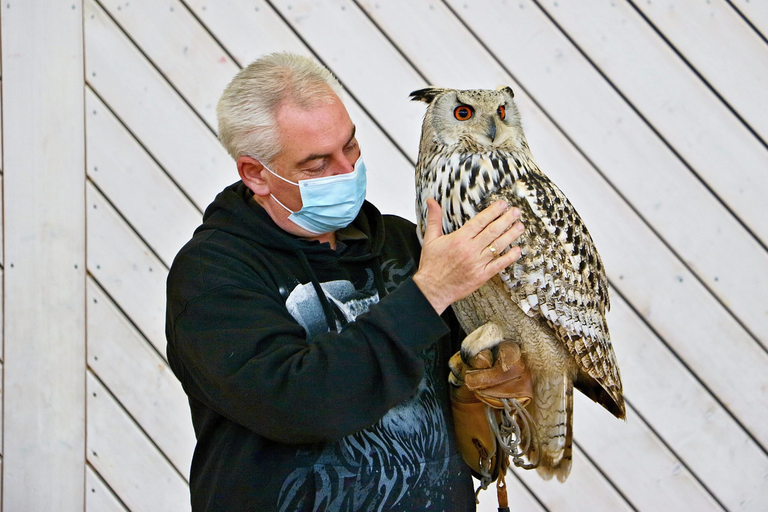 Nachdem Jürgen Wiesinger Uhu-Dame Emma, die im Alter von 14 Tagen in den Zoo kam und bis zu 40 Jahre alt werden kann, ausführlich vorgestellt hatte war nun seine Frau Constanze mit ihrem Schützling an der Reihe.
