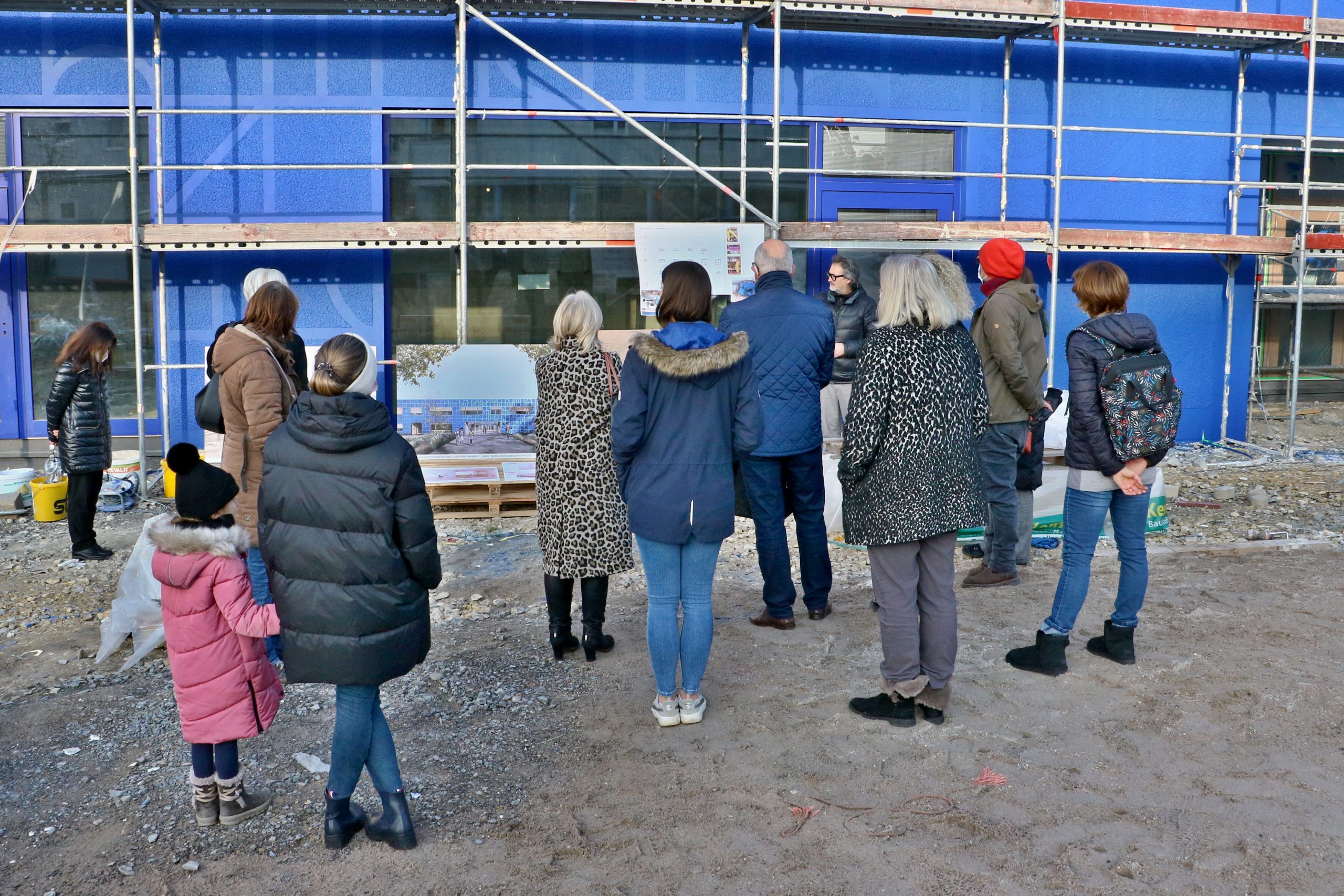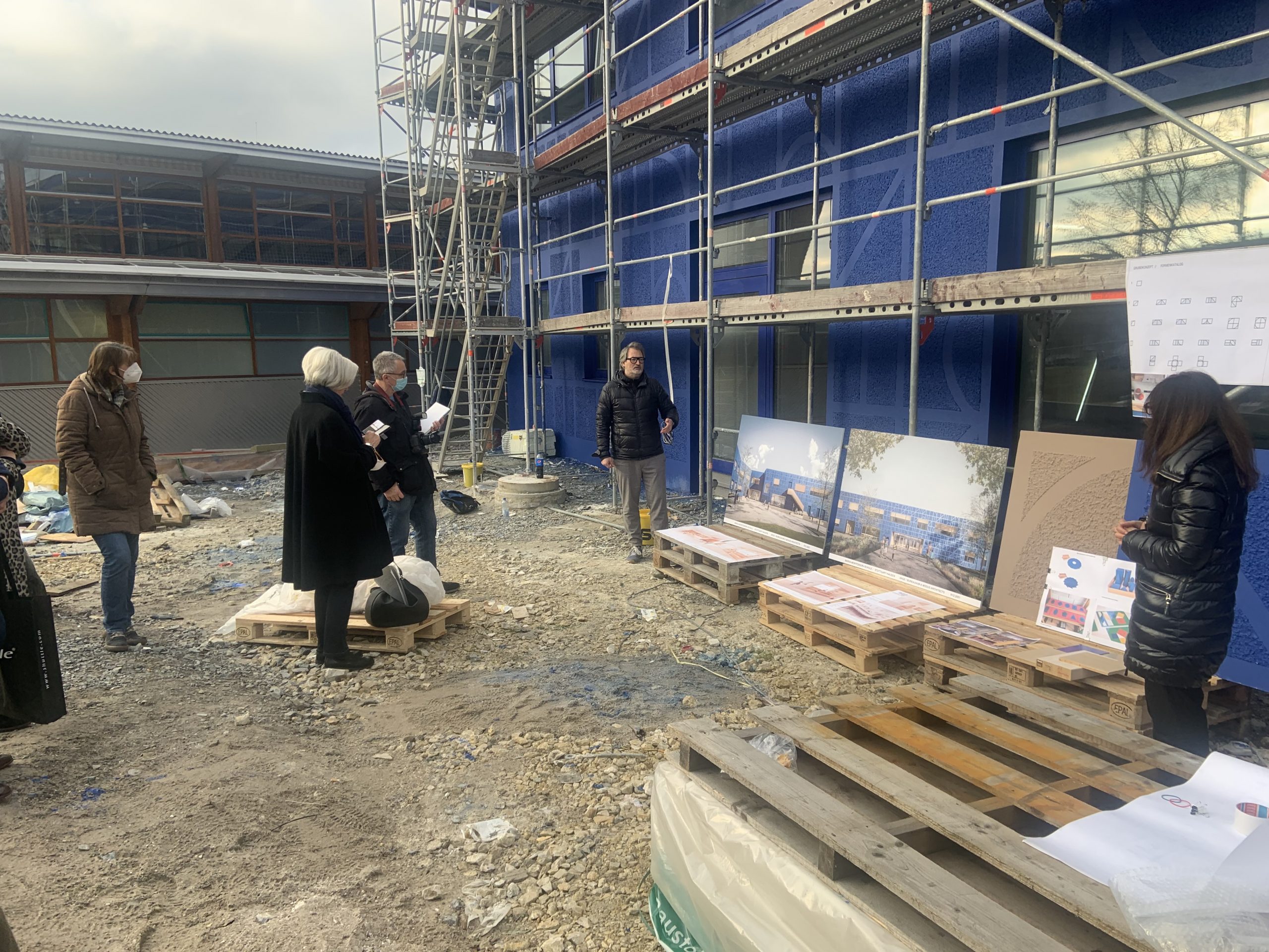 Um die Gründe für die Farbwahl zu erläutern und um die Wogen zu glätten, fand kurz vor den Weihnachtsferien eine Informationsveranstaltung auf dem Gelände des Neubaus statt. Um möglichst alle Fragen umfassend beantworten zu können, waren neben den beiden Architekten Tobias Hegemann und Chiara Baccarini auch die Weilimdorfer Bezirksvorsteherin Frau Ulrike Zich und die Rektorin der MMGH, Frau Dr. Angelika Müller-Zastrau, anwesend. Die Vertreter des Hochbauamtes und des Schulverwaltungsamtes hatten eingeladen und standen ebenfalls für Fragen zur Verfügung.