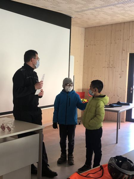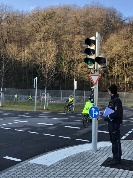 Nach einigen Übungsstunden stand kurz vor den Weihnachtsferien zuerst die schriftliche Lernzielkontrolle in der Schule und anschließend der praktische Teil der Fahrradprüfung unter der Aufsicht der Verkehrspolizisten an. Die Aufregung war nicht zu übersehen, doch Herr Kiefer und Herr Birnbaum schafften eine Atmosphäre, in der jedes Kind ohne Druck das Beste aus sich herausholen konnte. Die Prüfung begann mit einer Rundfahrt, die jedes Kind einzeln meisterte. Anschließend durften die Kinder gemeinsam alle Wege des Übungsplatzes befahren und ihr Können noch einmal unter Beweis stellen. Nach einer kurzen Auswertungsphase verkündeten die Polizisten die Ergebnisse. Zum Fahrradführerschein gab es zusätzlich einen Wimpel der Verkehrspolizei. Braucht ein Kind noch etwas mehr Übung, gab es einen Gutschein für ein weiteres Training in den Sommerferien.