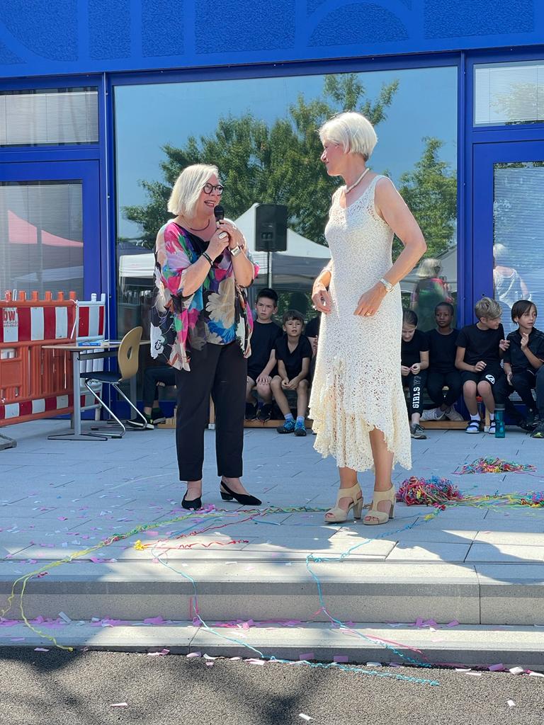 Anschließend hatte Bezirksvorsteherin Ulrike Zich das Wort. Sie lobte die Kinder und Lehrer für eine „Super Show“ die sie mit ihrem Theaterstück geboten hätten. Die darin vorgetragenen Lieder hätten sie in eine „fantastische Stimmung“ versetzt. Die Bezirksvorsteherin bezeichnete es als Ironie des Schicksals, dass der Beginn von Angelika Müller-Zastraus Zeit an der MMGH von einer Baustelle geprägt war und sie ihren Abschied jetzt wieder auf einer Baustelle begehen müsse. Müller-Zastrau habe sich aber weder von der ersten noch von der zweiten Baustelle unterkriegen lassen. Sie habe 1997 von Beginn an das Montessori-Konzept fest im Stadtbezirk verankert. Dies sei nicht einfach gewesen, da sie parallel dazu die vorhandene und die neu zugezogene Bevölkerung im Stadtteil zusammenführen musste. Eine große Hilfe sei ihr dabei Volker Rösch, Leiter des benachbarten Jugendhauses, gewesen. Die Bezirksvorsteherin führte weiter aus, dass es für Müller-Zastrau die Worte „Es geht nicht“ weder gab noch gibt. Sie habe durch unendlich viel Kreativität die Schule zu dem gemacht, was sie heute sei. Müller-Zastrau sein ein großes Vorbild für viele andere und habe die MMGH zu einem Qualitätssiegel gemacht. Bezirksvorsteherin Zich betonte, dass sie, die Schüler und Lehrer und der Stadtbezirk tief in der Schuld von Angelika Müller-Zastrau stehen würden und dankte ihr vielmals für alles, was sie für die Schule und die Schulgemeinschaft bewegt und initiiert hat. Ihre Rede beendete Ulrike Zich mit einer, augenzwinkernden, Entschuldigung an Ben, den Schulhund. Sie habe völlig vergessen, dass er heute auch in den Ruhestand gehe und daher leider kein Abschiedsleckerli für ihn besorgt.