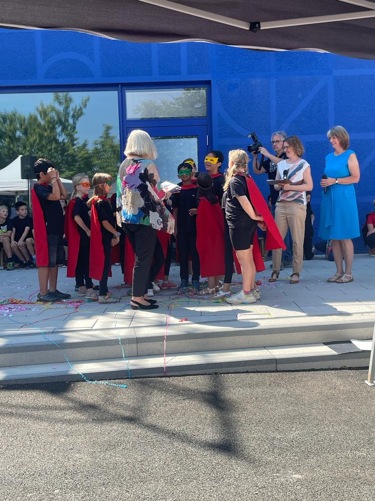 Einen super Abschied bescherten Schüler, Lehrer und pädagogische Fachkräfte der Maria Montessori Grundschule Hausen (MMGH) ihrer Schulleiterin Angelika Müller-Zastrau im Rahmen der Jubi­läumsveranstaltung zum 25-jährigen Bestehen der Schule in Hausen.