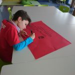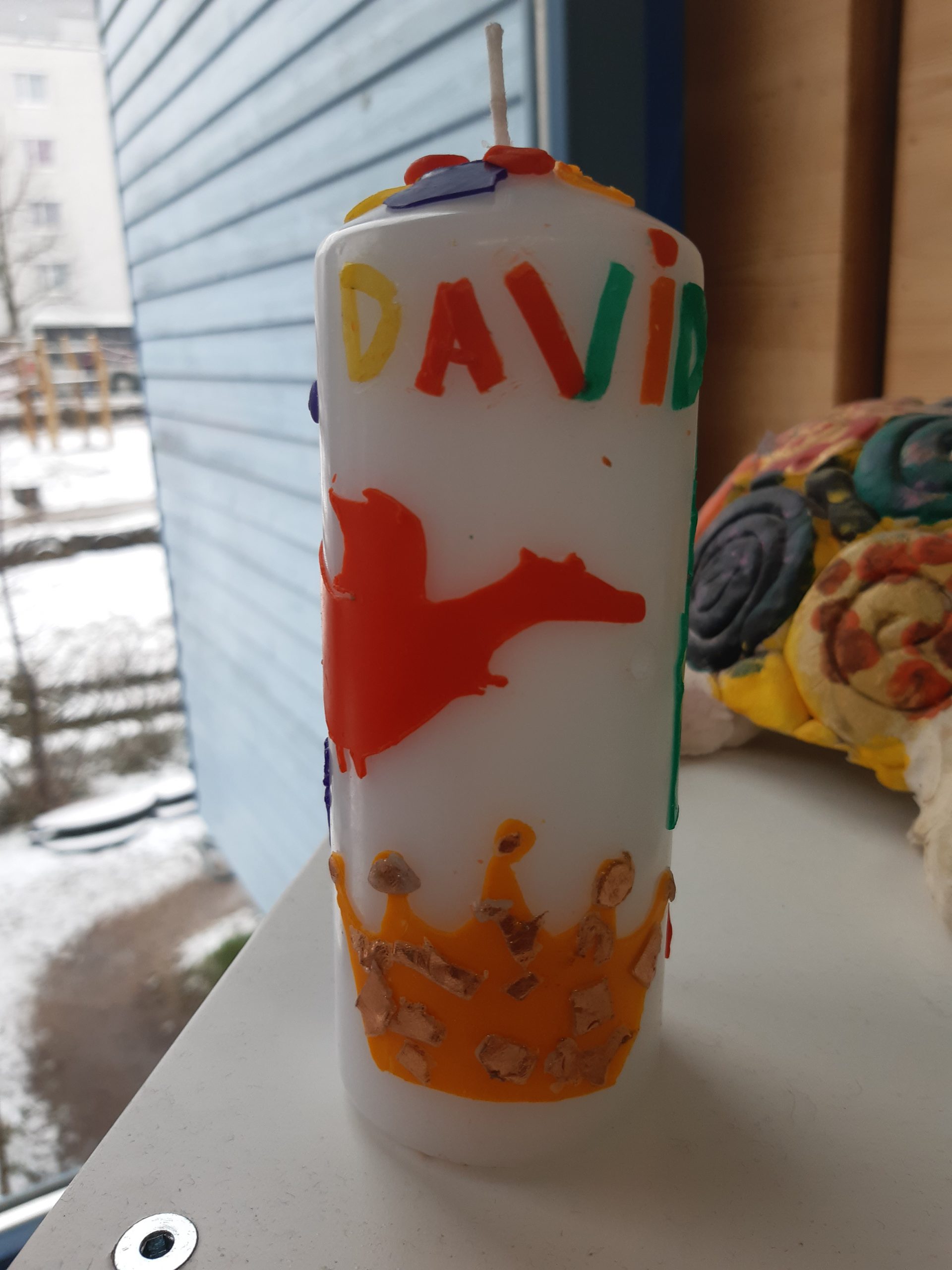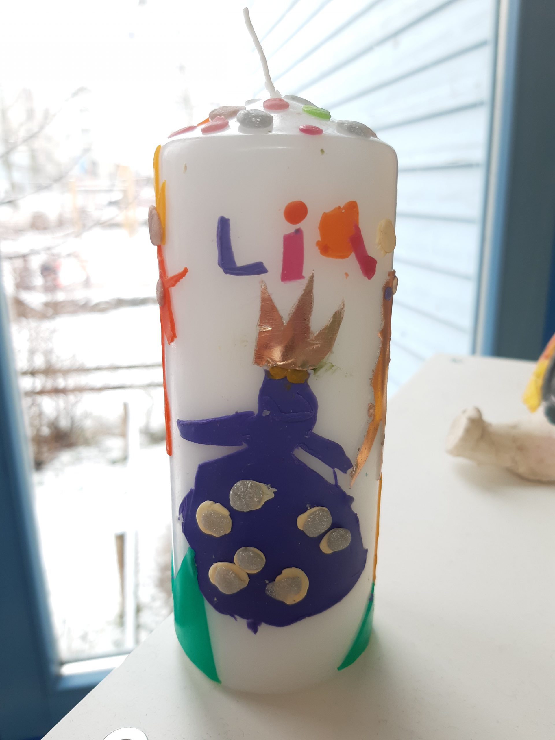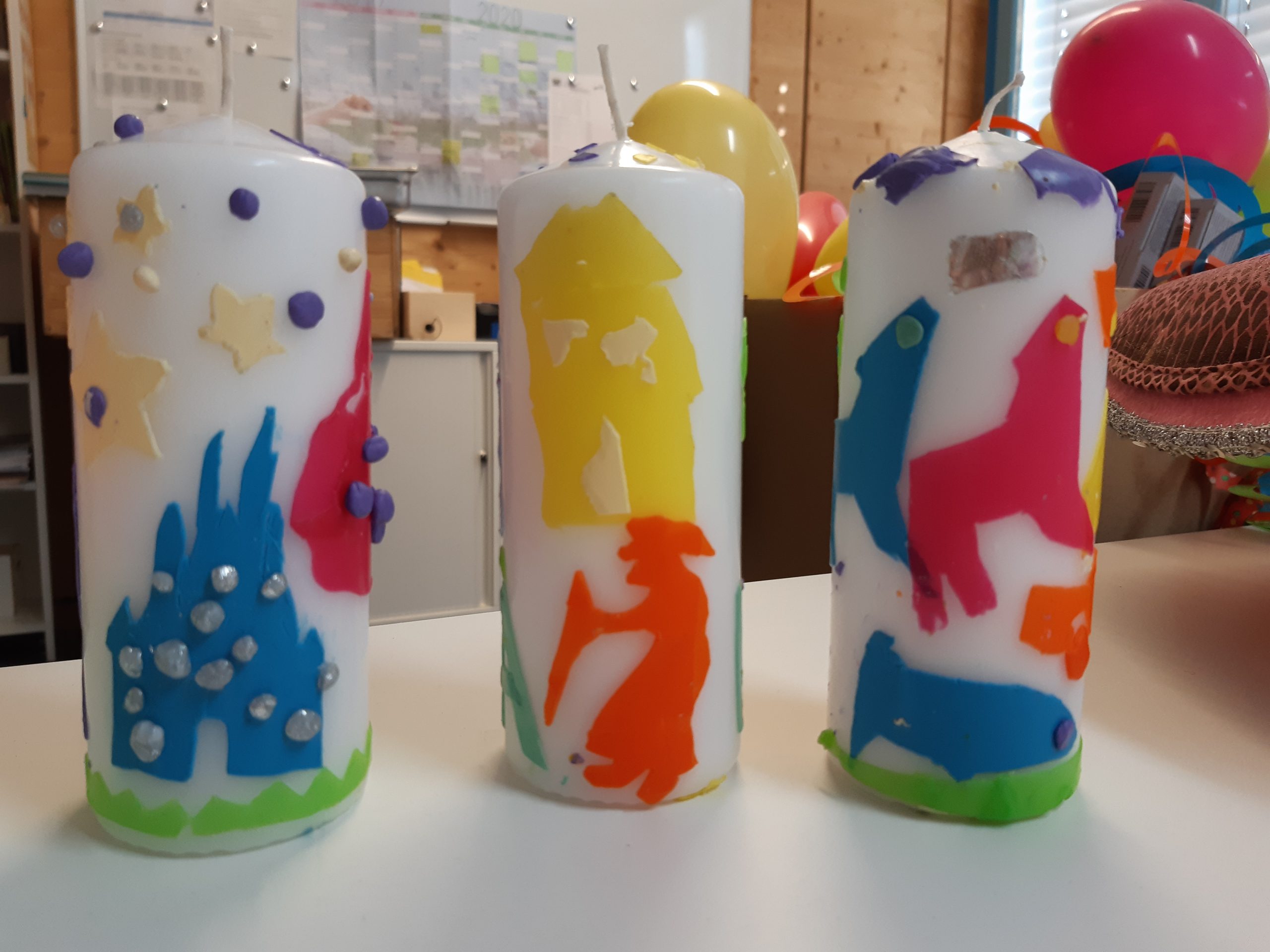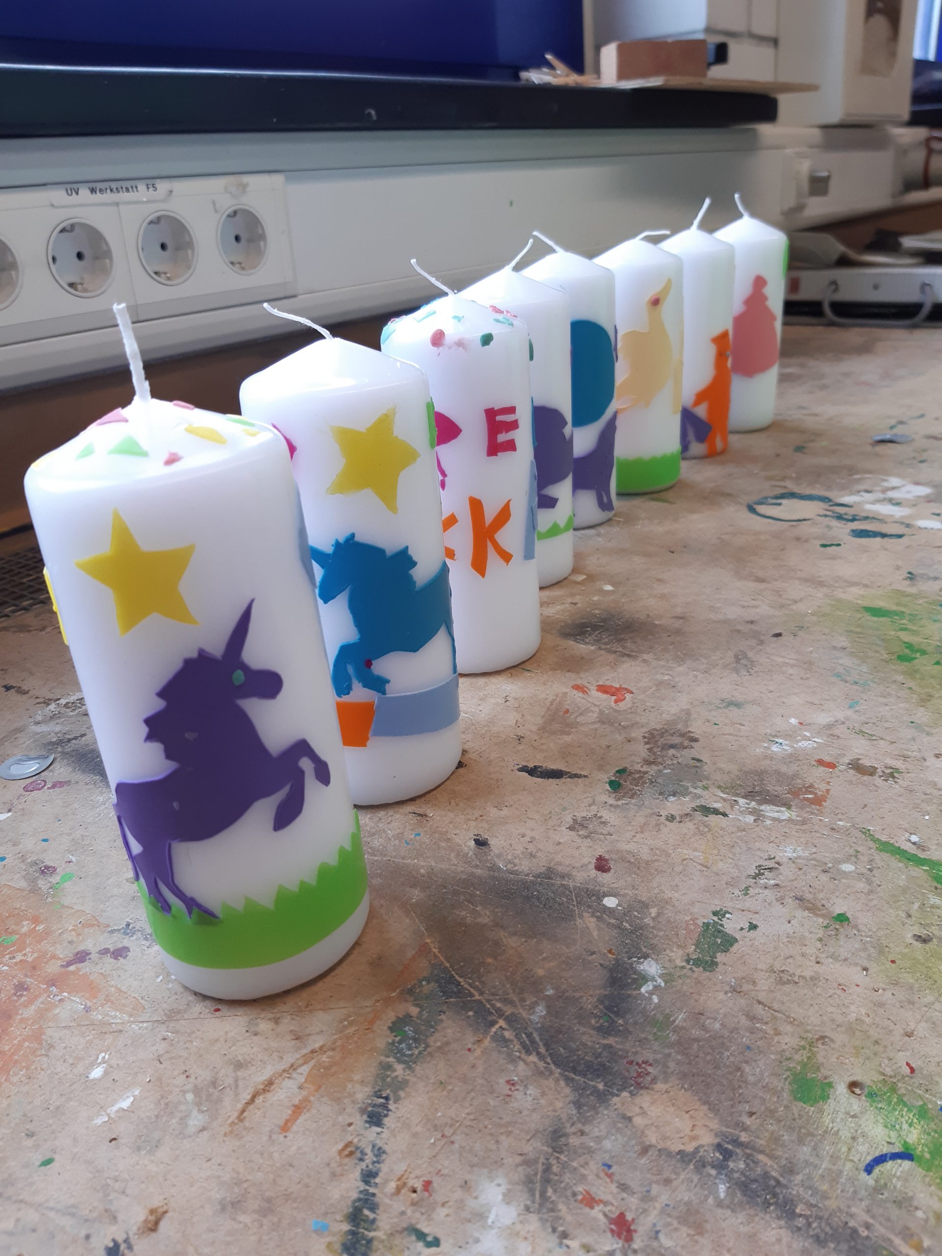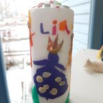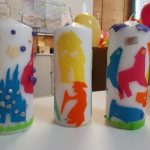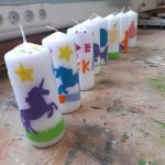 Des Weiteren gab es das Angebot, weiße Stumpenkerzen mit bunten Wachsplatten zu verzieren. Hierzu überlegten sich die Kinder zunächst ihre eigenen Märchenidole, malten anschließend kreative Schablonen wie Einhörner, Drachen, Prinzessinnen oder Wölfe und übertrugen diese im letzten Schritt auf die Wachsplatten. Mit viel technischem Geschick, Kreativität und Spaß am Kerzenverzieren entstanden so am Ende des Angebotes farbenfrohe, individuelle Kerzendesigns. Ein Highlight bestand darin, am Ende die Kerzen mit den eigenen Namen der Kinder zu personalisieren.