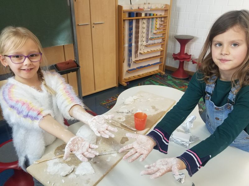 Am dritten Ferientag gab es verschiedene Angebote, an denen die Kinder nach eigener Wahl teilnehmen konnten. Mit Lena Stiehle fertigten sie aus Ton einzigartige Gebilde mit Hilfe einer speziellen Aufbautechnik an. Dazu wurden aus Ton lange „Würste“ geformt, die um ein Gefäß gelegt wurden, bis es bedeckt war. Sobald die Würste verstrichen wurden, entstand ein stabiles Gefäß. Dieses wird in den Osterferien noch glasiert. Man darf also gespannt bleiben!
