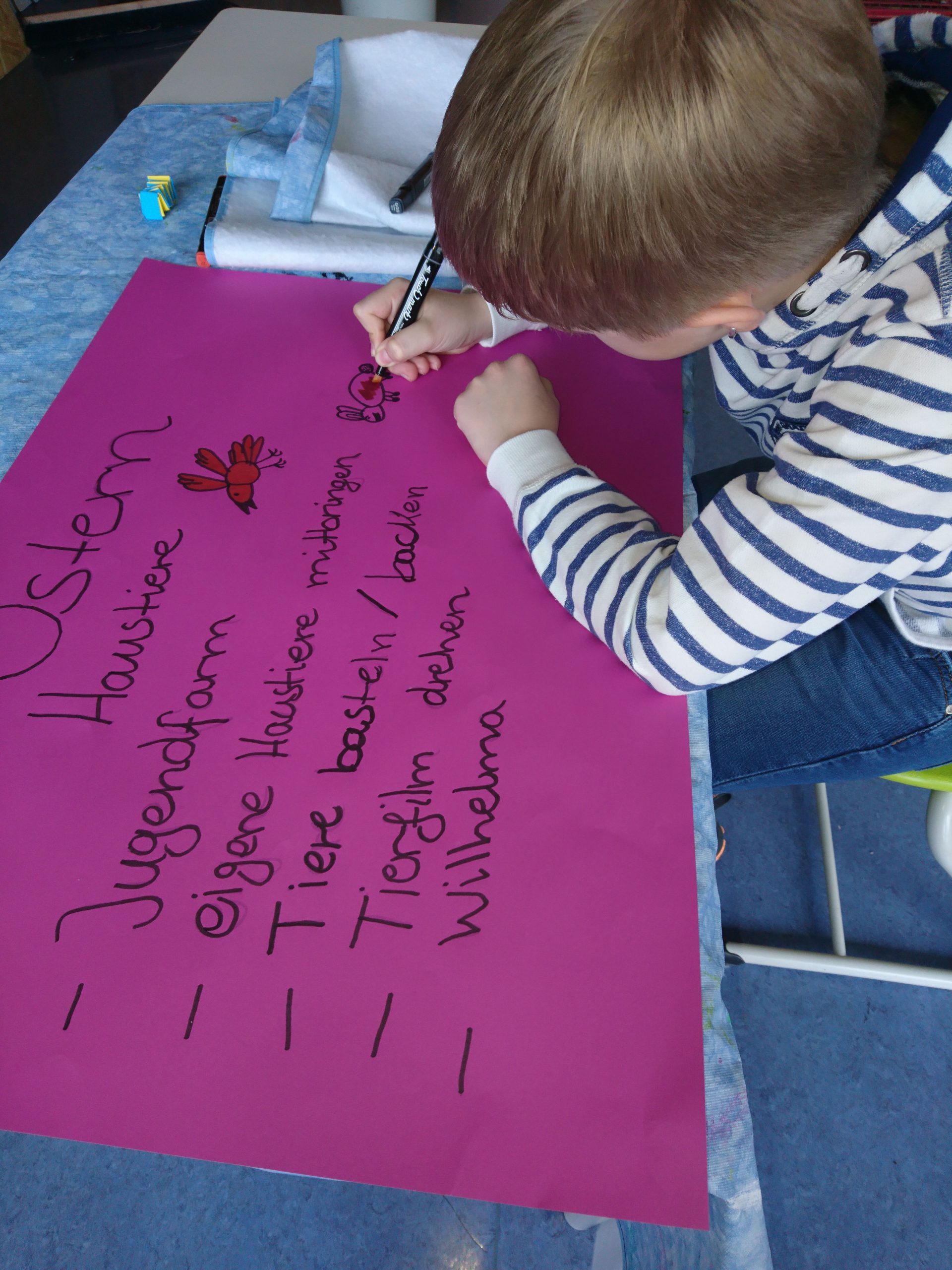 Auch das von Herrn Kurt durchgeführte Planungsangebot „Meine Ferien“ kam gut an. Die Ferienkinder waren von der ersten Sekunde an voll dabei. Zuerst besprachen sie das ganze Thema und überlegten gemeinsam, was sie alles schon in den Ferien gemacht haben , um eigenen Ideen und Wünsche für die Ferien zu finden und zu formulieren. So manch fiel es nicht so leicht, sich Ideen für neue Angebote oder Themen für die kommenden Ferienbetreuungen zu überlegen. Wünsche, wie Go-Kart fahren bis hin zu den Vorstellungen einen Tierfilm zu drehen, waren z.B. Ideen der Kinder. Alle Ideen und Wünsche vereinigte die Ferienkinder dann im Anschluss auf Plakaten. Wir dürfen gespannt sein, welche Angebote die kommenden Ferien bereit halten werden. Diese Ideen werden nun allen Ferienkindern in Kleingruppen vorgestellt, erklärt und dann gewählt.