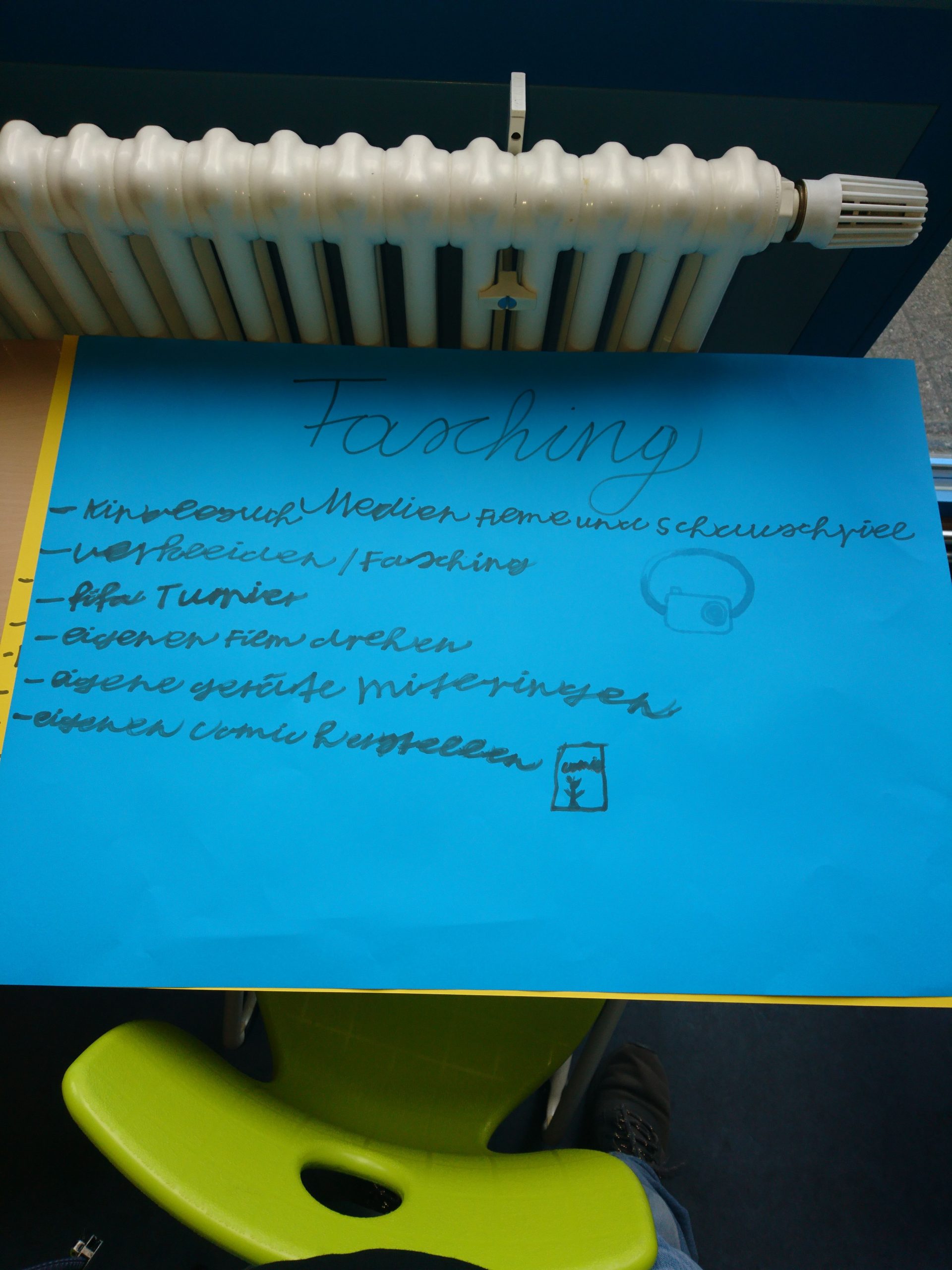 Die ersten beiden Tage der Faschingsferien standen ganz unter dem Vorzeichen der anstehenden Faschingsparty am Dienstagnachmittag. Hierfür fanden an diesen beiden Tagen verschiedene Angebote statt. Da bei einer richtigen Faschingsparty bunte Masken auf keinen Fall fehlen dürfen, wurden fleißig Masken gebastelt . Aus Gipsbinden und Wasser entstanden an den ersten beiden Ferientagen Spiderman, Prinzessin und Co., welche stolz auf einer abschließenden Modenschau bei der Faschingsparty präsentiert wurden.