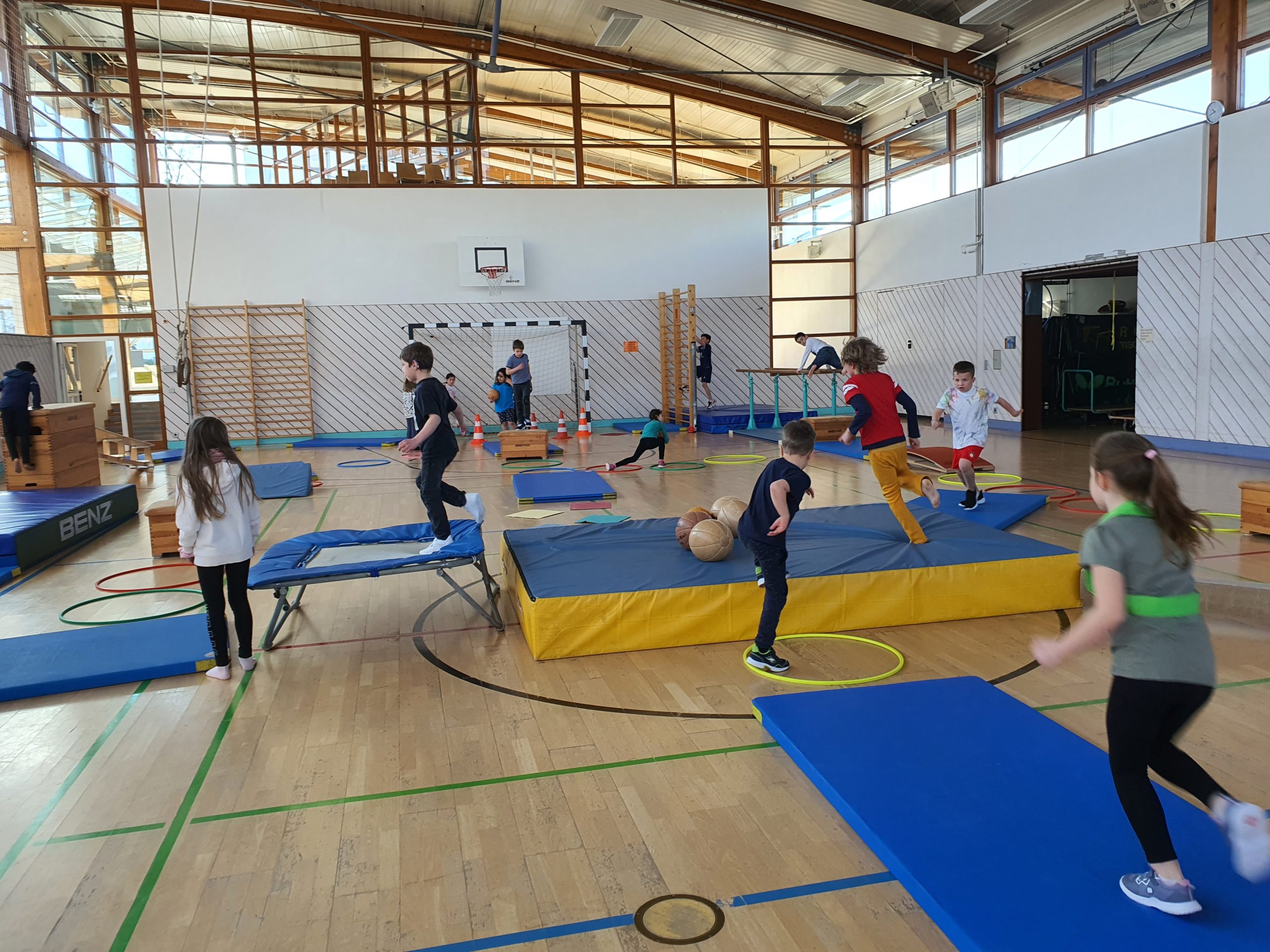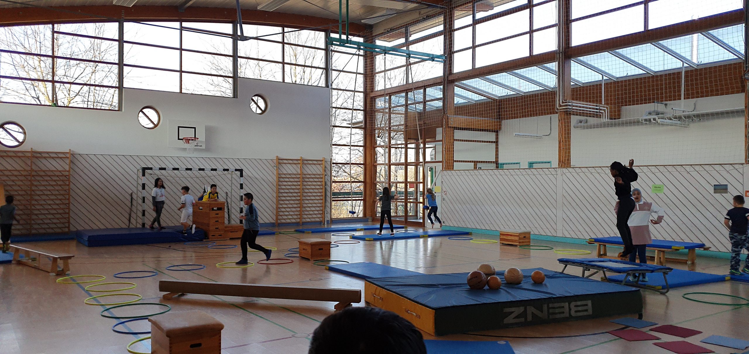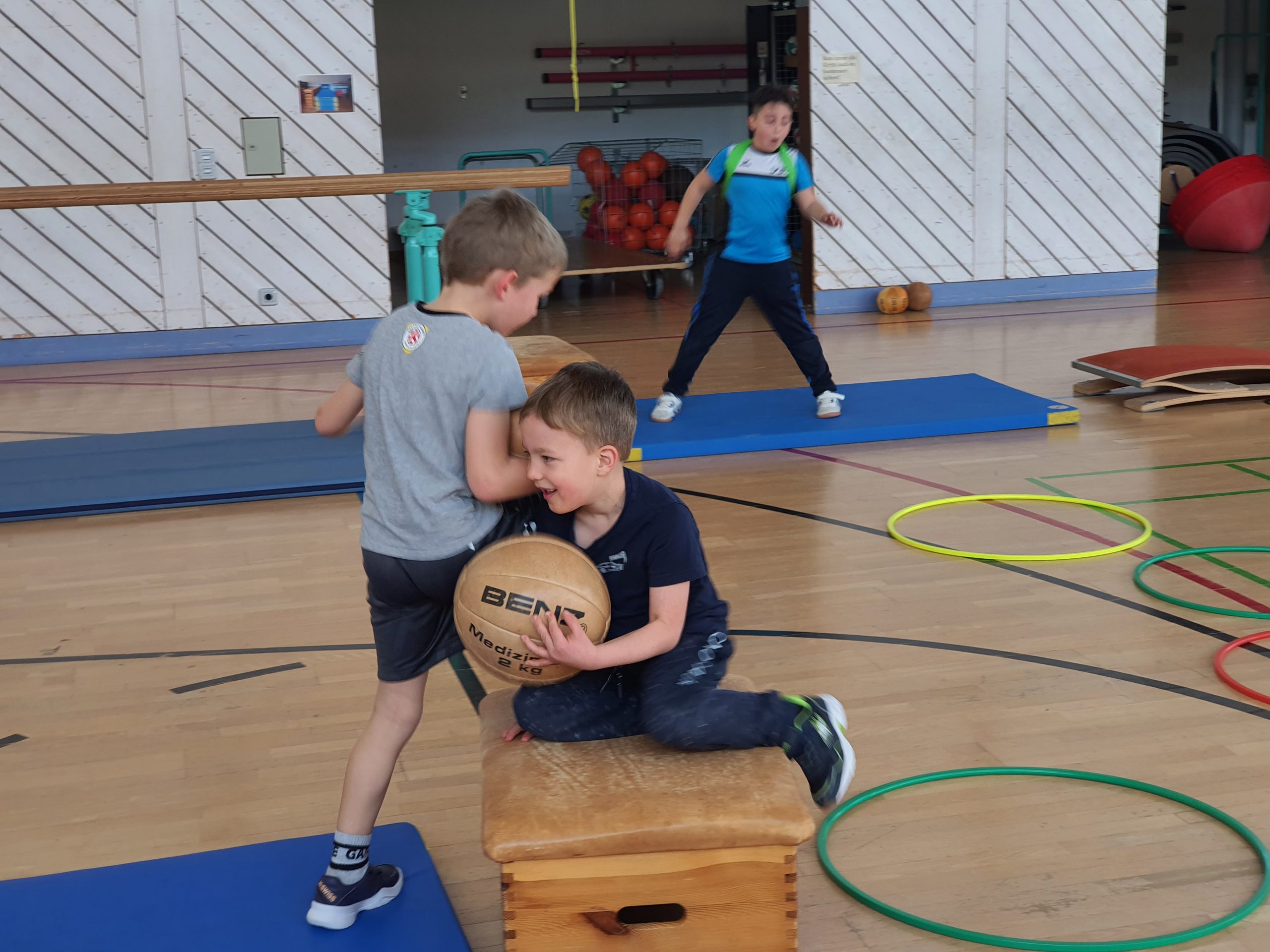 In der Turnhalle erwartete die Ferienkinder ein vielseitiges Bewegungsprogramm. Von bekannten Klassikern bis hin zu neuen unterhaltsamen Spielen war alles dabei. Beim Pantomime-Spiel und der Modenschau schlüpften die Mädchen und Jungen in unterschiedliche Rollen, was zu viel Freude führte. Am letzten Tag verwandelte sich die Turnhalle in einen großen Dschungel in dem die Gruppe unterschiedlichste Bewegungsformen erprobten und im Anschluss noch das Affen-Fangspiel spielten.
