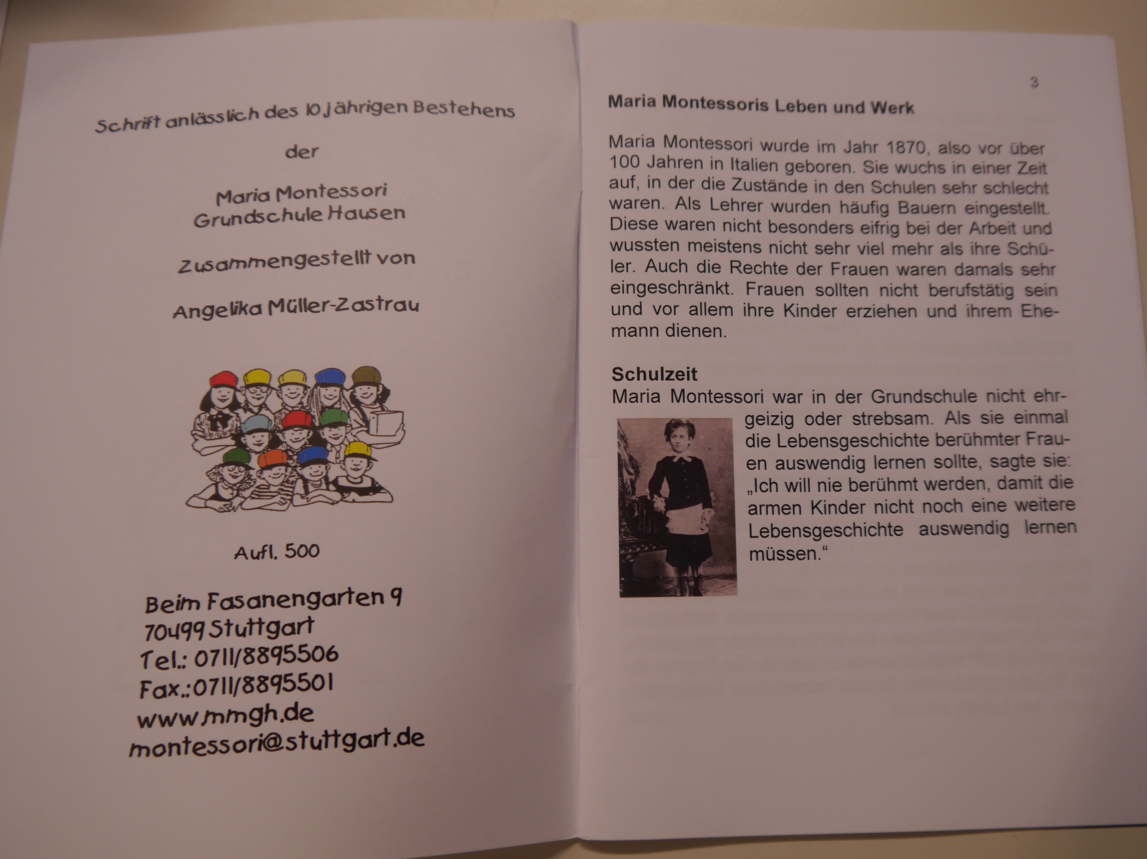 Schrift anlässlich des 10 jährigen Bestehens der Maria Montessori Grundschule Hausen, zusammengestellt von Dr. Angelika Müller-Zastrau.