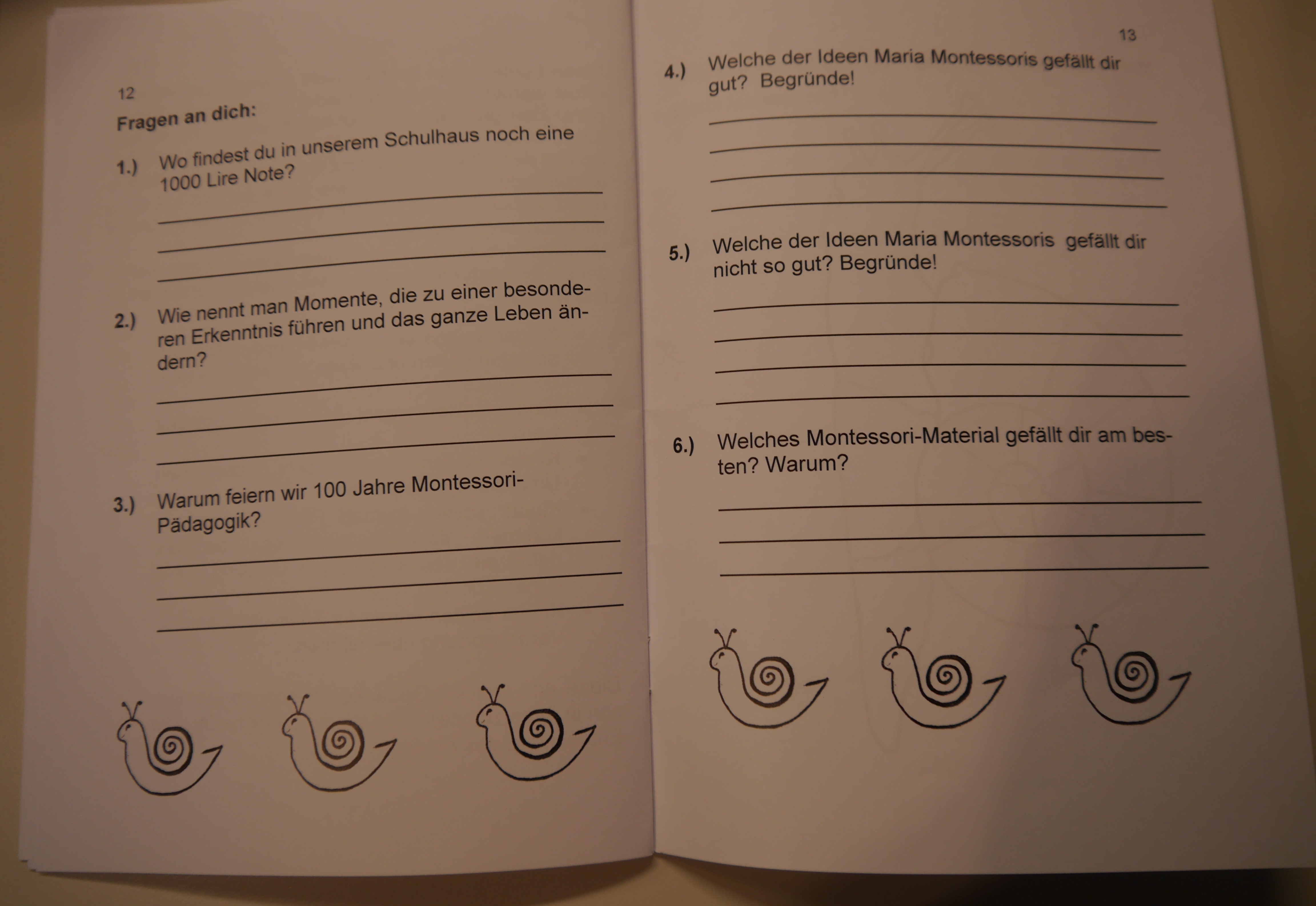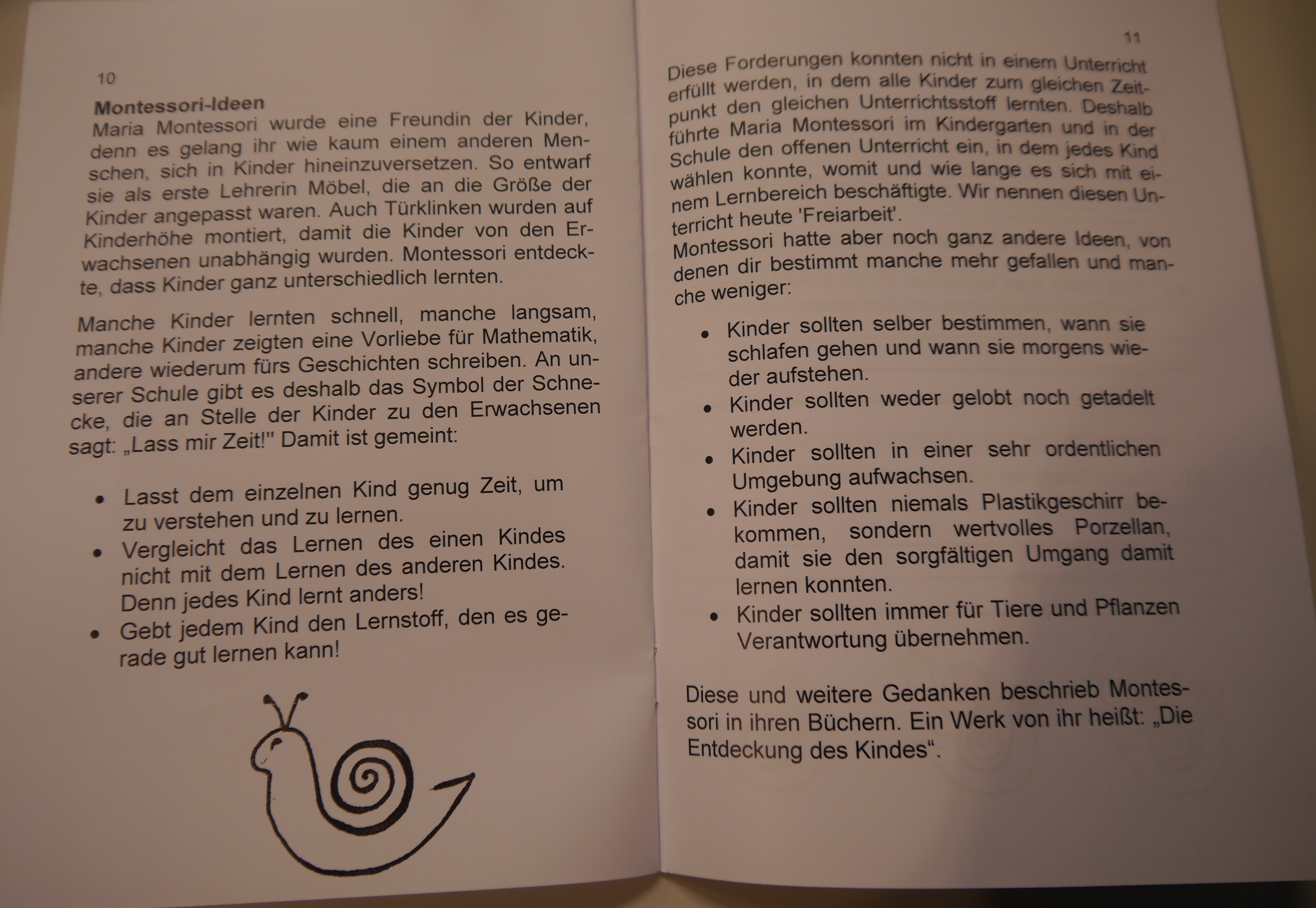 Im diesem Buch schreiben Kinder der Maria Montessori Grundschule Hausen für andere Kinder. Im Buch gibt es kurze Texte für Anfänger und lange Texte für fortgeschrittene Leserinnen und Leser. Im Entstehungsprozess gestalteten ebenfalls Kinder unserer Schule die Bilder zu den bereits vorhandenen Texten. Das Buchprojekt war also Schreib- und Lesemotivation in einem und lieferte dem Kunstunterricht interessante Motive. Die Schnecke symbolisiert ja unseren Leitspruch ‚Lass mir Zeit‘, deshalb der Titel und deshalb ist auch eine klitzekleine Schnecke auf jeder Kunstseite des Buches versteckt. Manchmal ist es recht schwer, die Schnecke zu finden und es gelingt nur bei ganz genauem und konzentriertem Hinsehen. Das Buch wird in der Montessori Grundschule Hausen als Lesefibel eingesetzt und es gibt Lesebegleithefte dazu. In diesen Heftchen sind verschiedene Textübungen zu erfüllen, die sich direkt auf das Buch beziehen. Zudem ist das Buch ideal für die Kooperation Kindergarten-Grundschule geeignet, denn die Vorschulkinder lieben es, den Geschichten zuzuhören, die Bilder zu betrachten und zu beschreiben und schließlich natürlich – die kleine im Bild versteckte Schnecke zu finden.