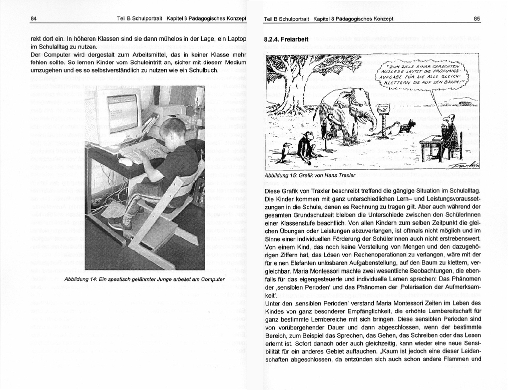 Es folgt eine Befragung der Schulgemeinde – LehrerInnen, SchülerInnen und Eltern – die das beschriebene Schulprofil einer kritischen Prüfung unterzieht, aus der Bestätigung aber auch Änderungswünsche abzuleiten und Transfermöglichkeiten auf die Profilbildungen und Selbstevaluationsprozesse anderer Schulen abzuleiten sind.